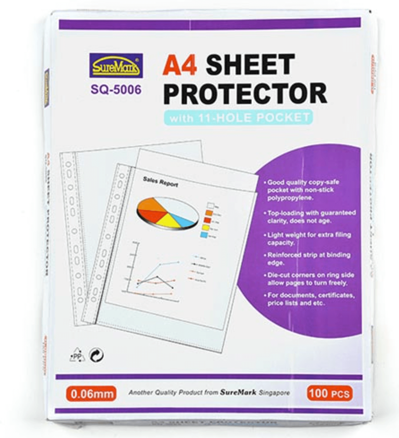 Bìa lổ Suremark SQ-5006 với nhựa trong dày, có lổ dọc thân, khả năng lưu trữ 5 tờ giấy A4 (210 x 297mm) lưu trữ bill thanh toán, tiền, thẻ, hóa đơn ứng dụng trong các dịch vụ bán hàng lưu trữ và bảo vệ chứng từ kích cở A4, A5 kết hợp với bìa còng hoặc bìa acco