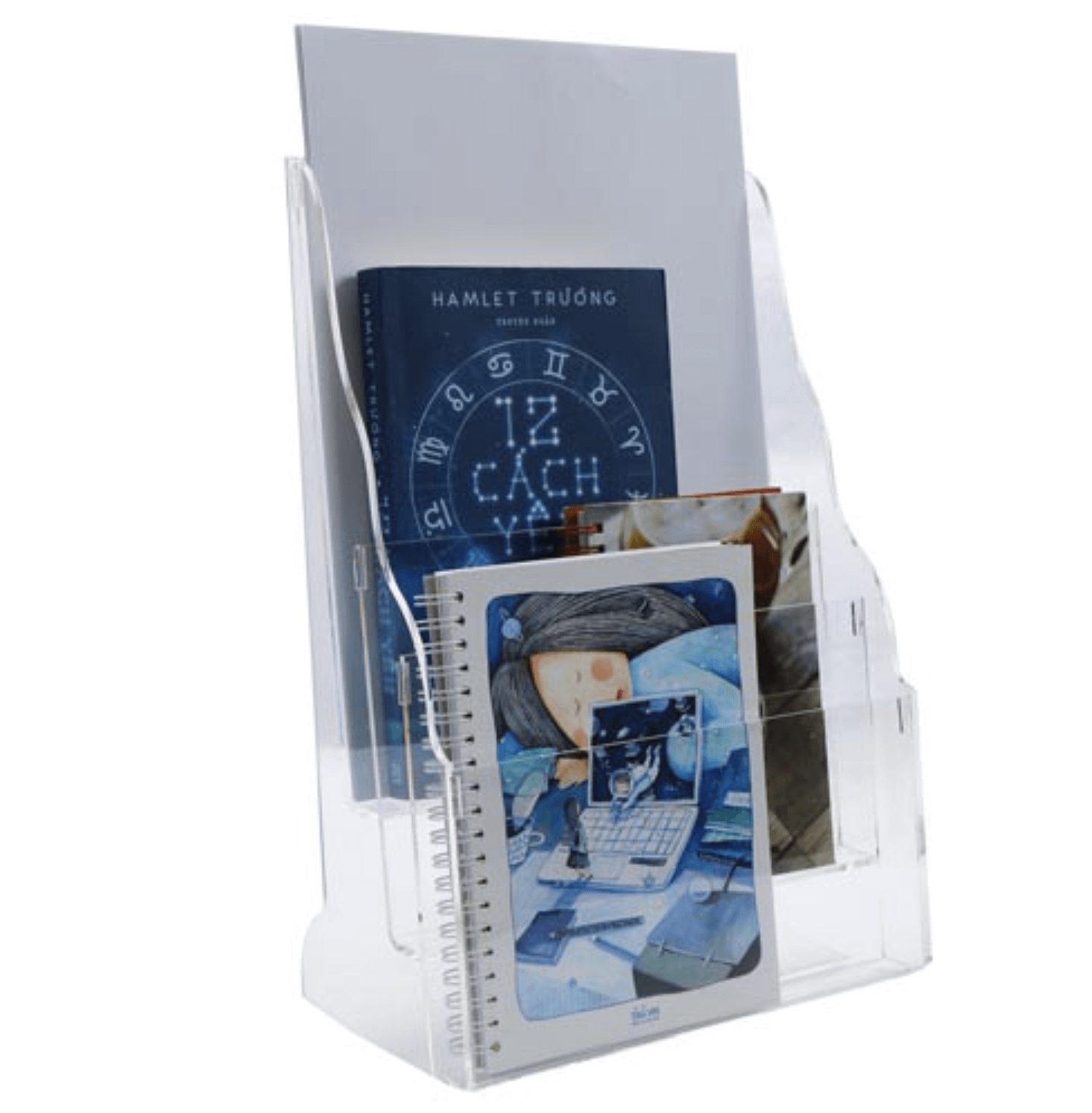 Khay brochure 3 ngăn A4 (B-105) với chất liệu nhựa trong, 3 ngăn, khả năng lưu trữ 300 tờ giấy A4 (210 x 297mm) ghi chú nội dung thông báo, hội nghị, thuyết trình lưu trữ, phân loại, và trưng bày tài liệu, catalog, brochure, tờ rơi