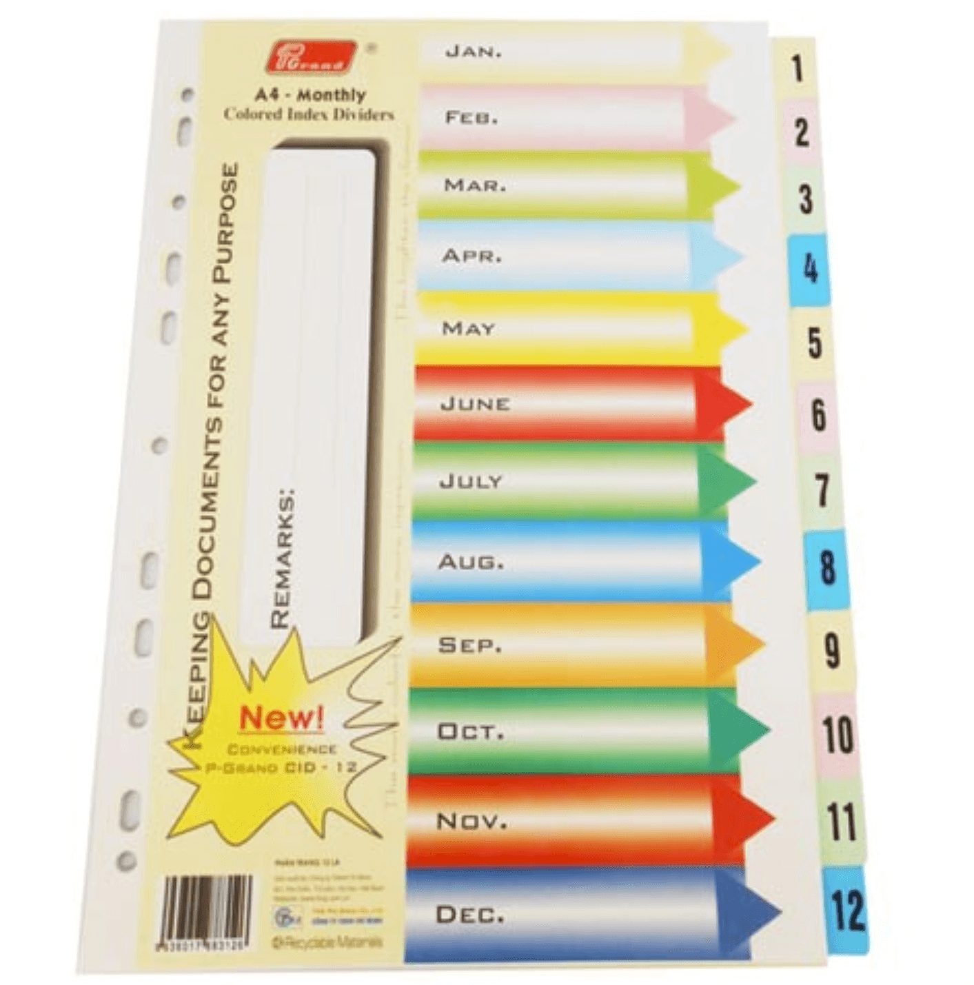 Phân trang giấy 12 màu (B-3.2) với kích thước A4 (210 x 297mm), chất liệu giấy, dọc thân bấm lổ, phân loại theo màu, tạo 12 ngăn ghi chú nội dung ,ký kết hợp đồng phân nhóm nội dung chứng từ theo tháng, sử dụng cùng với bìa còng hồ sơ